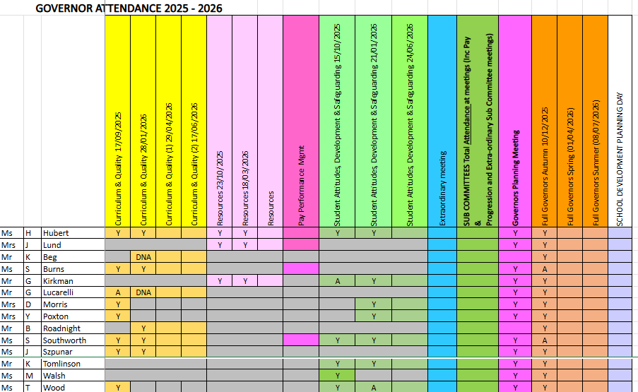 | Governor | Autumn 10/12/25 | Spring 01/04/26 | Summer 08/07/26 | Total Attendance |