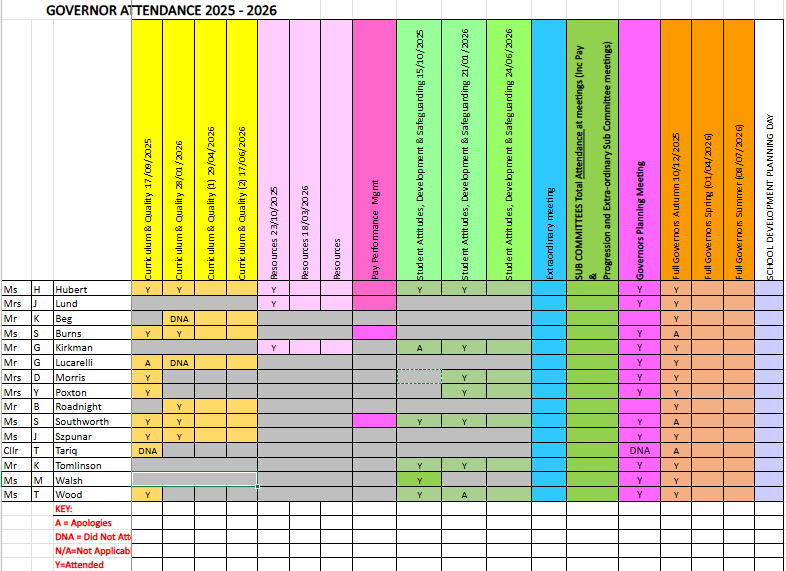 | Governor | Autumn 10/12/25 | Spring 01/04/26 | Summer 08/07/26 | Total Attendance |